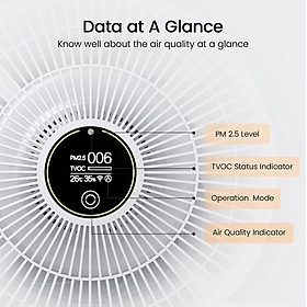 Màn hình OLED thiết kế ngay phần mặt trên của máy lọc, cung cấp các thông số chi tiết về môi trường xung quanh như bụi PM2.5, TOVC, nhiệt độ và độ ẩm không khí ngay thời gian thực giúp người dùng dễ dàng theo dõi hơn.