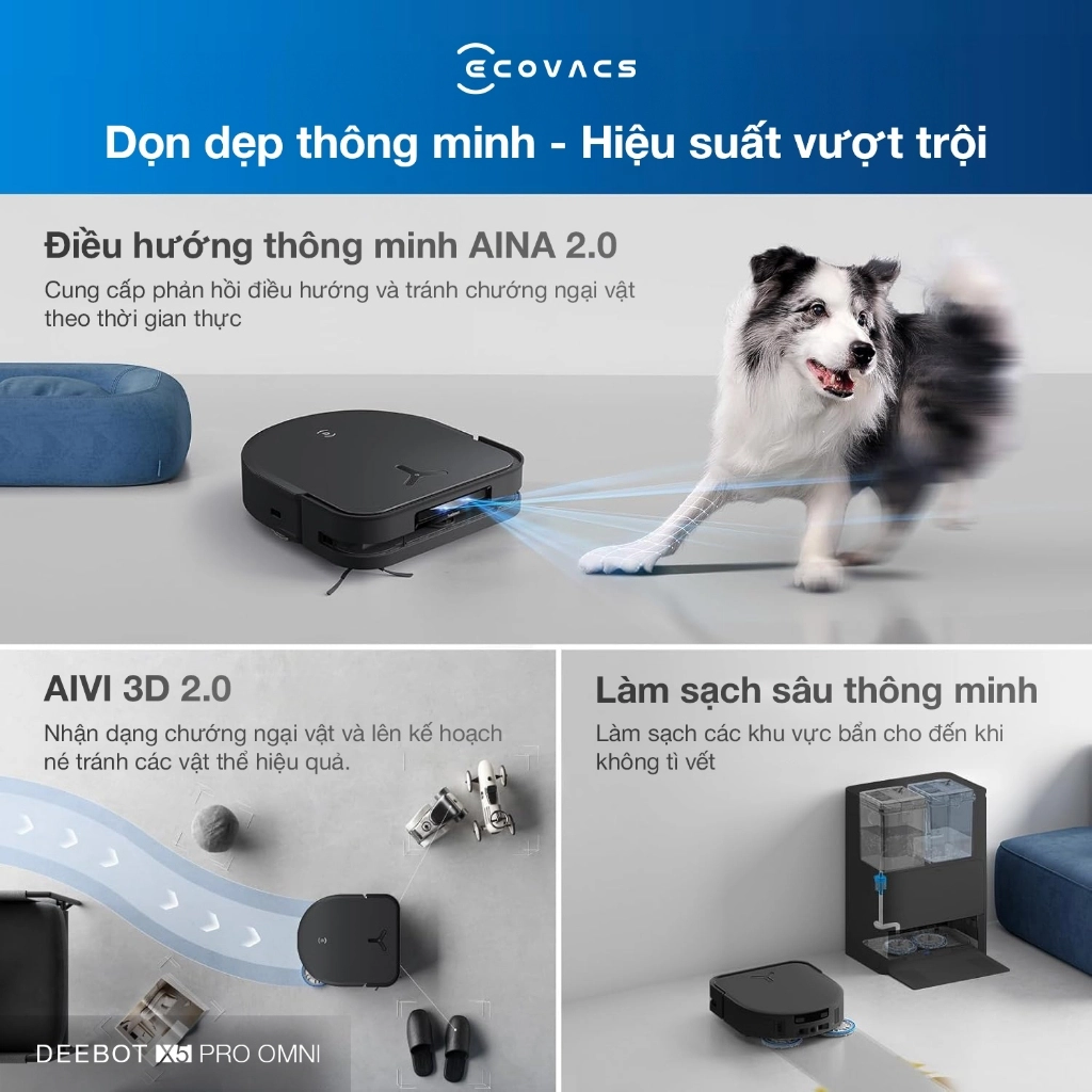 Robot hút bụi thông minh X5 Pro OMNI được áp dụng mô hình điều hướng lộ trình thông minh AINA 2.0, đánh dấu sự bức phá trong lĩnh vực phát triển robot của Ecovacs. Đây là hệ thống tránh chướng ngại vật lớn nhỏ khác nhau và điều hướng linh hoạt, cùng kết hợp với “công nghệ học sâu và học tăng cường”